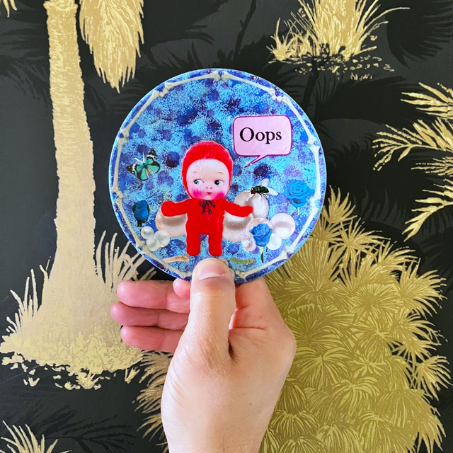 Add a touch of whimsy to your décor with this adorable one-of-a-kind collage artwork displayed on a charming trinket dish. Featuring a vintage doll dressed in a vibrant red suit, surrounded by elegant pearls, this unique piece captures playful innocence with the doll saying “Oops.” A delightful conversation starter! Elevate your space with this quirky, eye-catching accessory that celebrates nostalgia and fun.