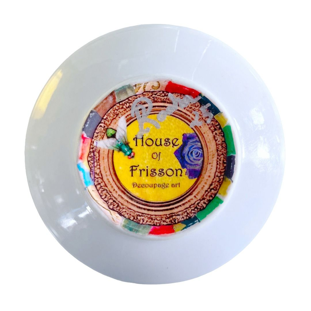 This is a work of hand cut collage, re-purposing a ceramic dish, turning it into a one-of-a-kind art piece for display purposes. This is part of my sustainable practice to save the environment, by up-cycling existing materials.