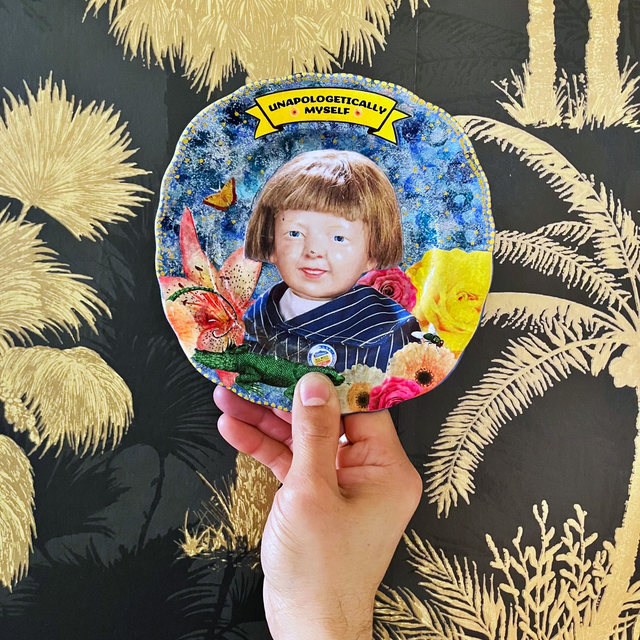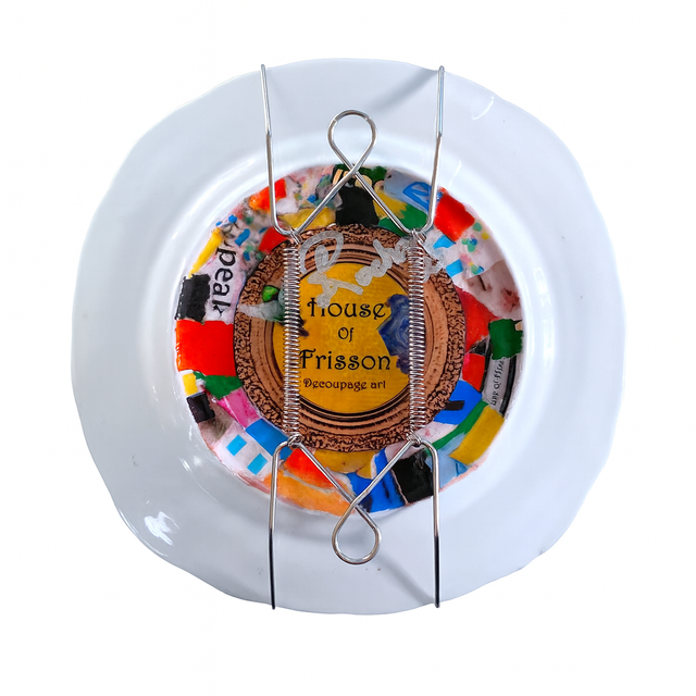 This is a work of hand cut collage, re-purposing a ceramic plate, turning it into a one-of-a-kind art piece to be displayed on the wall. This is part of my sustainable practice to save the environment, by up-cycling existing materials.