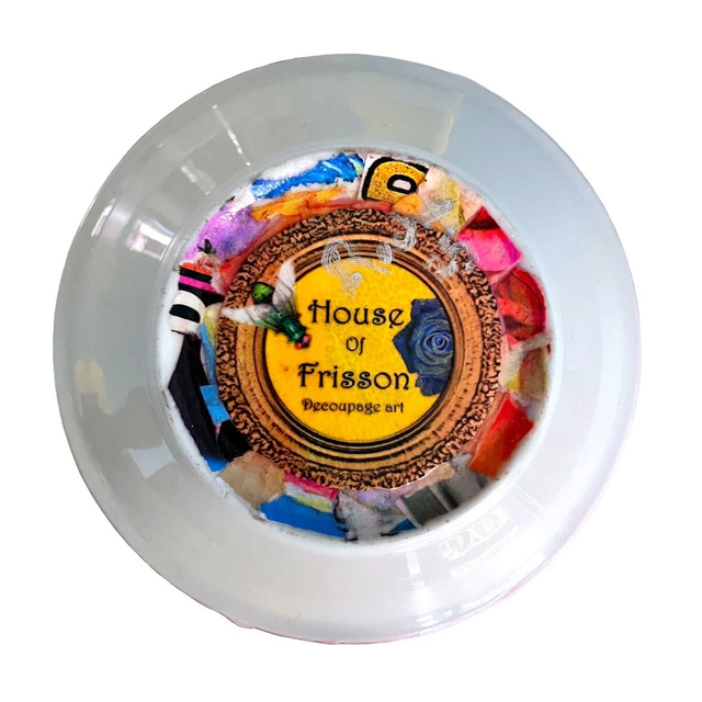 This is a work of hand cut collage, re-purposing a ceramic dish, turning it into a one-of-a-kind art piece for display purposes. This is part of my sustainable practice to save the environment, by up-cycling existing materials.
