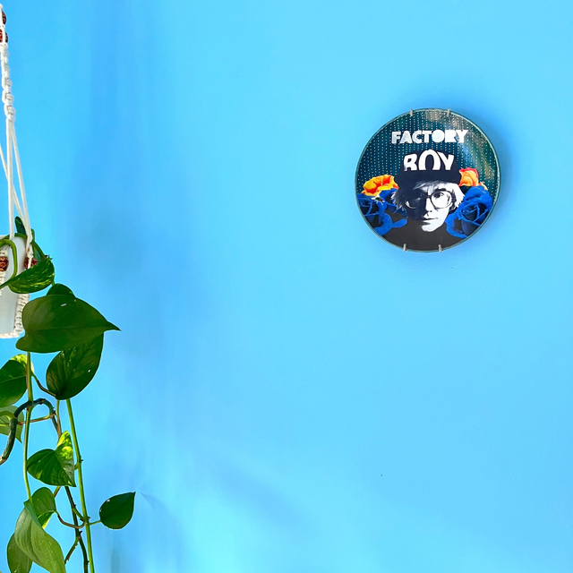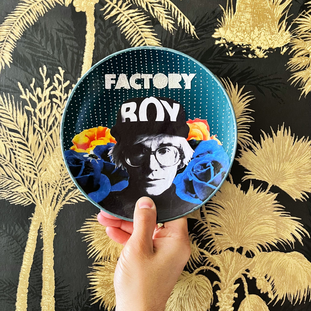 Calling all Andy Warhol's fans! This stunning ceramic plate showcases a unique collage artwork of the iconic pop-art legend himself, complete with his signature BOY cap, surrounded by vibrant flowers. Use it as a decorative piece on a shelf, or wall, to add a pop of colour and personality to your home.