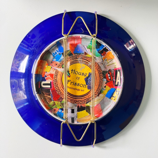 This is a work of collage, re-purposing a ceramic dining plate, turning it into a one-of-a-kind art piece to be displayed on the wall. This is part of my sustainable practice to save the environment, by up-cycling existing materials.