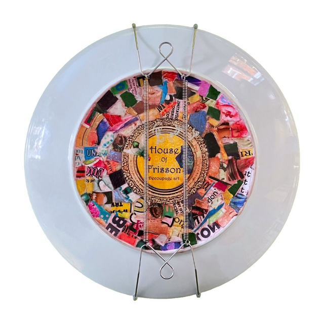 This is a work of hand cut collage, re-purposing a ceramic plate, turning it into a one-of-a-kind art piece to be displayed on the wall. This is part of my sustainable practice to save the environment, by up-cycling existing materials.