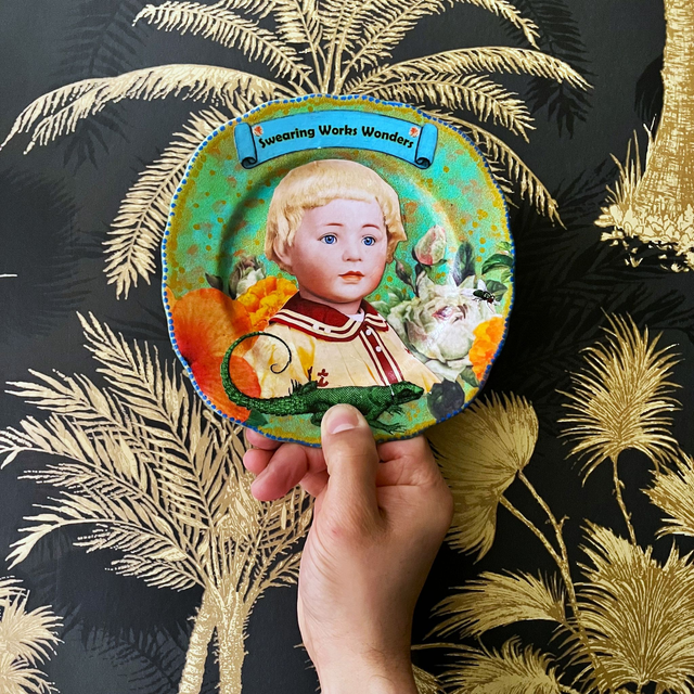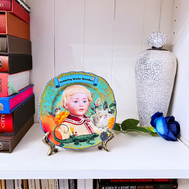 A decorative wall plate for those who know that a well-placed expletive can be healing. Featuring a serene blonde doll, surrounded by lush florals, a butterfly, a lizard, and a fly who’s clearly seen things. The banner reads: “Swearing Works Wonders” — a mantra for the gloriously unfiltered and emotionally expressive.