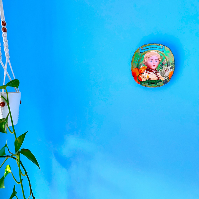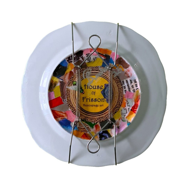 This is a work of hand cut collage, re-purposing a ceramic plate, turning it into a one-of-a-kind art piece to be displayed on the wall. This is part of my sustainable practice to save the environment, by up-cycling existing materials.
