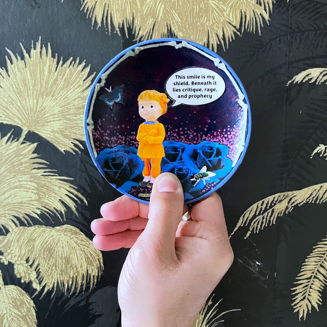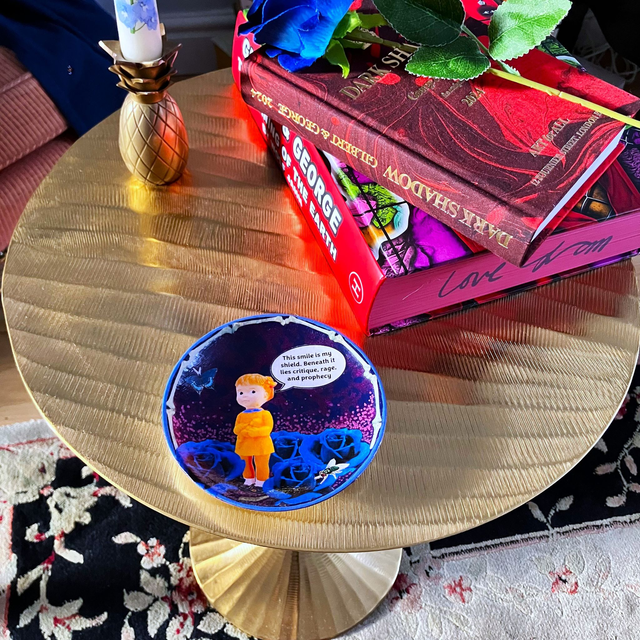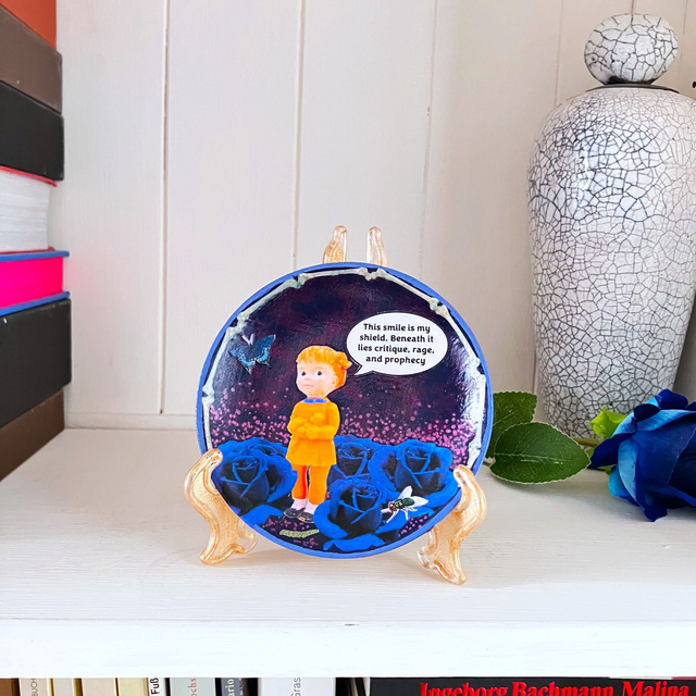 Discover this charming trinket dish showcasing a one-of-a-kind collage design featuring an orange-dressed little doll brimming with attitude, surrounded by elegant blue roses. Perfectly blending whimsy and sophistication, this unique piece adds a pop of colour and personality to any dresser, coffee table, or desk.