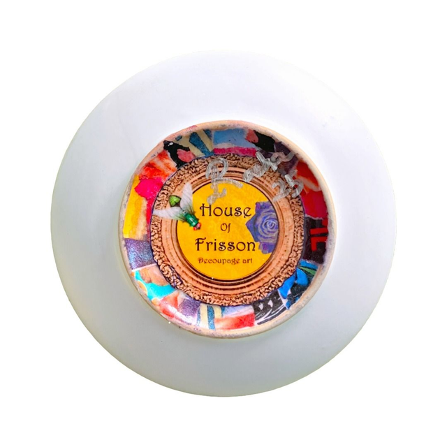 This is a work of hand cut collage, re-purposing a ceramic dish, turning it into a one-of-a-kind art piece for display purposes. This is part of my sustainable practice to save the environment, by up-cycling existing materials.