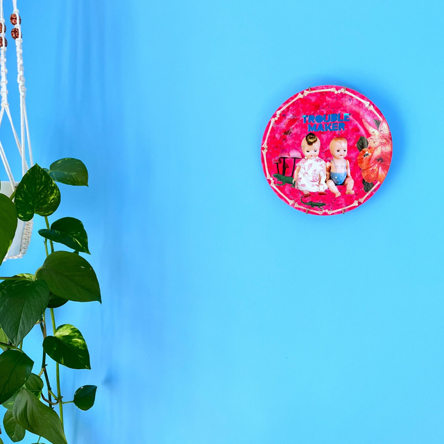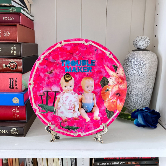 Whether you're a troublemaker yourself or know someone who is, this collage plate is a fun and eye-catching addition to any home. Add some whimsical charm to your decor with this unique collage on a plate featuring two vintage dolls with mischievous expressions. The vibrant neon pink background adds a pop of colour to any space. Perfect for those who appreciate quirky and playful artwork, this one-of-a-kind piece is sure to impress guests and spark conversations.